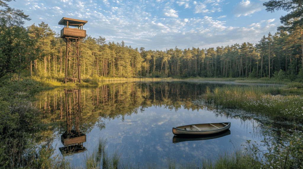 這裡是立陶宛最早的自然保護區——Aukštaitija 國家公園 的範圍,擁有超過百座湖泊與茂密的針葉林。高架木塔能俯瞰湖泊交錯的壯麗景色,適合拍攝日落或進行水上活動。