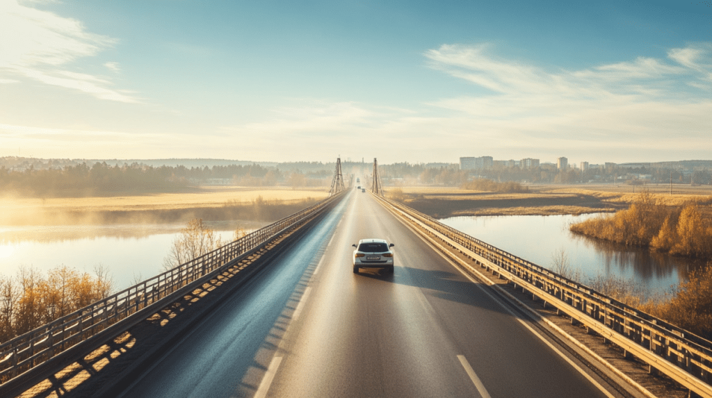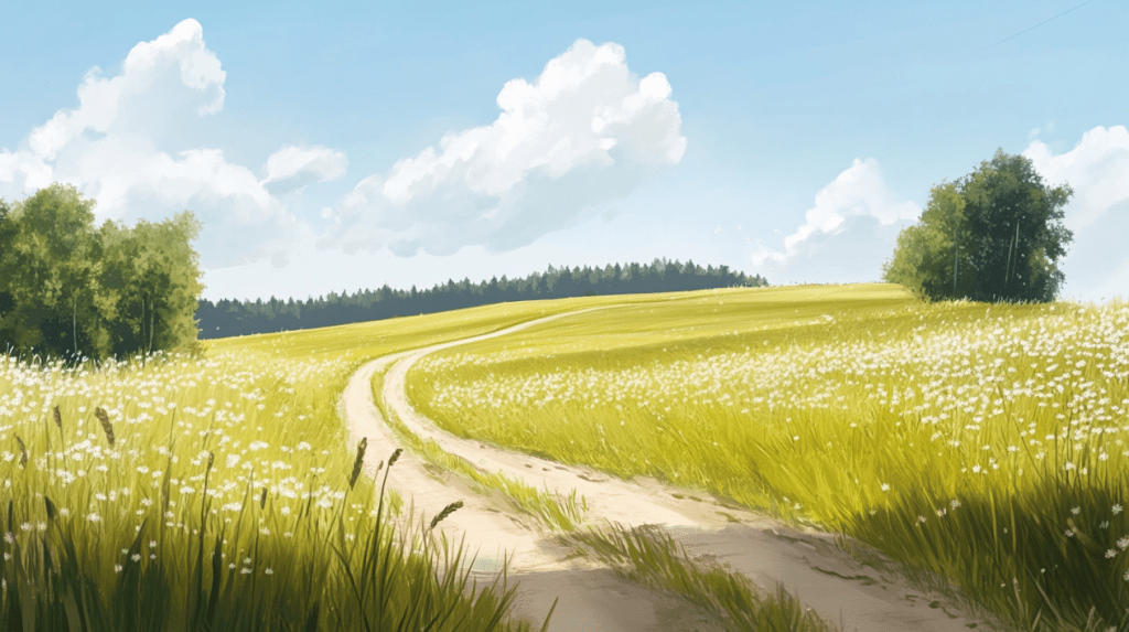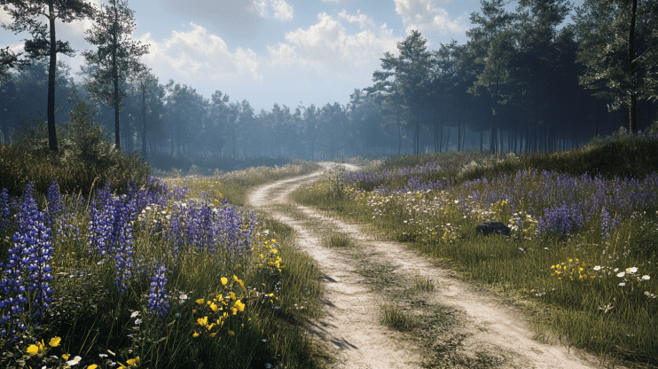 As they crossed an old iron bridge, the scenery began to shift. The fields grew wider, more textured. Pine forests thickened in the distance, and the road narrowed slightly, bordered now by wildflowers and tall grass waving in the breeze.