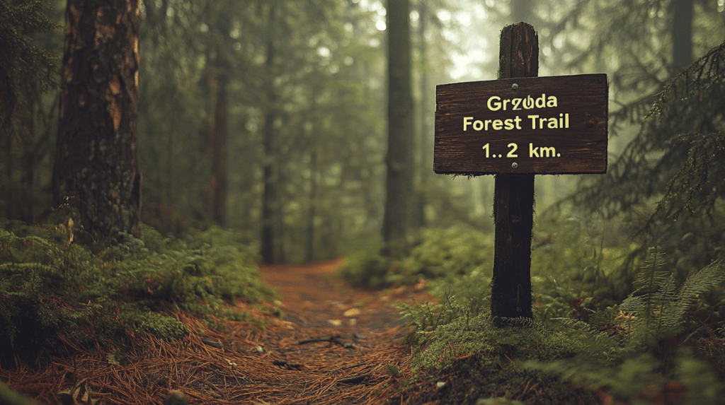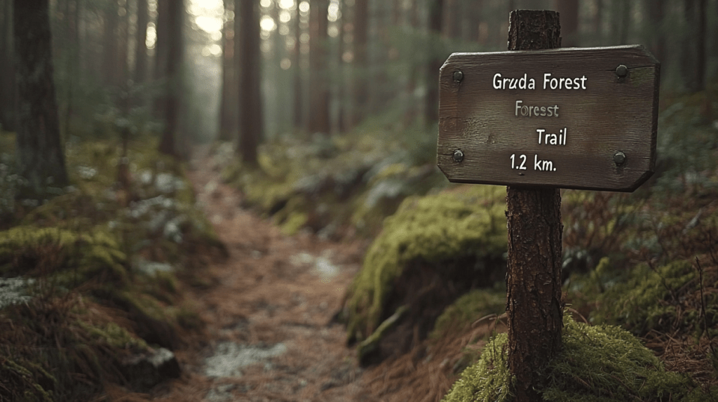 The van turned off the main road onto a narrower gravel path, the tires crunching softly. Sunlight filtered through the trees, casting scattered shadows on the windshield. A wooden sign nailed to a pine read: “Grūda Forest Trail – 1.2 km.”