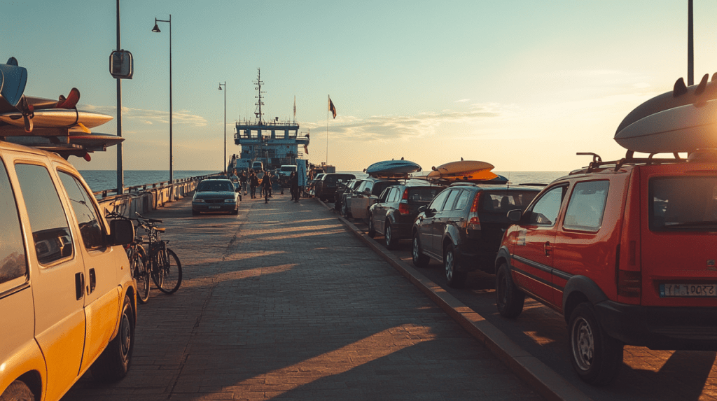 他們買票的過程很簡單,只是簡單地用英文確認了幾句話,然後把車開進了排隊區。 前方的車輛有些載著衝浪板,有些綁著自行車或背包裝備,氣氛輕鬆而帶著點冒險的味道。