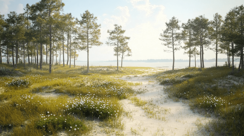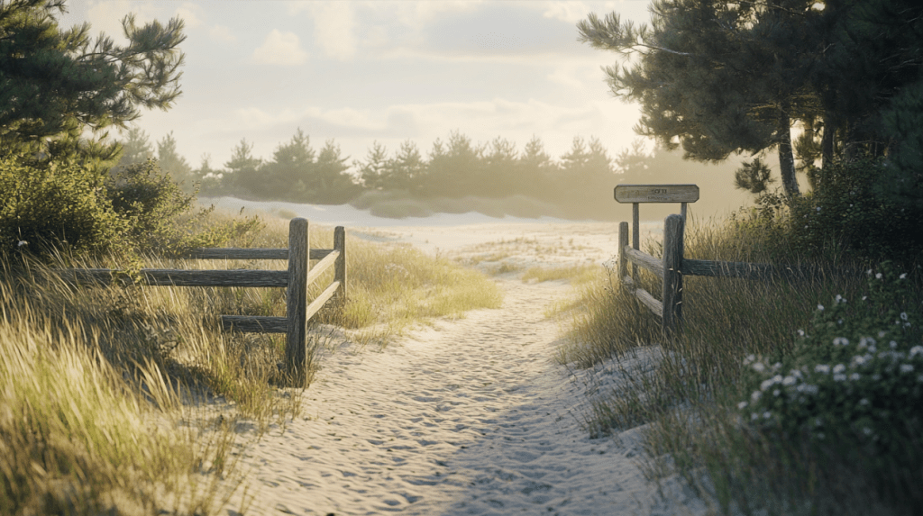 托馬斯將車子停進一個碎石鋪成的小型停車區,附近有一個簡單的木製指標,指向一條蜿蜒穿過低矮松林和野草的小徑。遠遠的,淡金色的沙丘在初夏午後的陽光下微微閃光。
