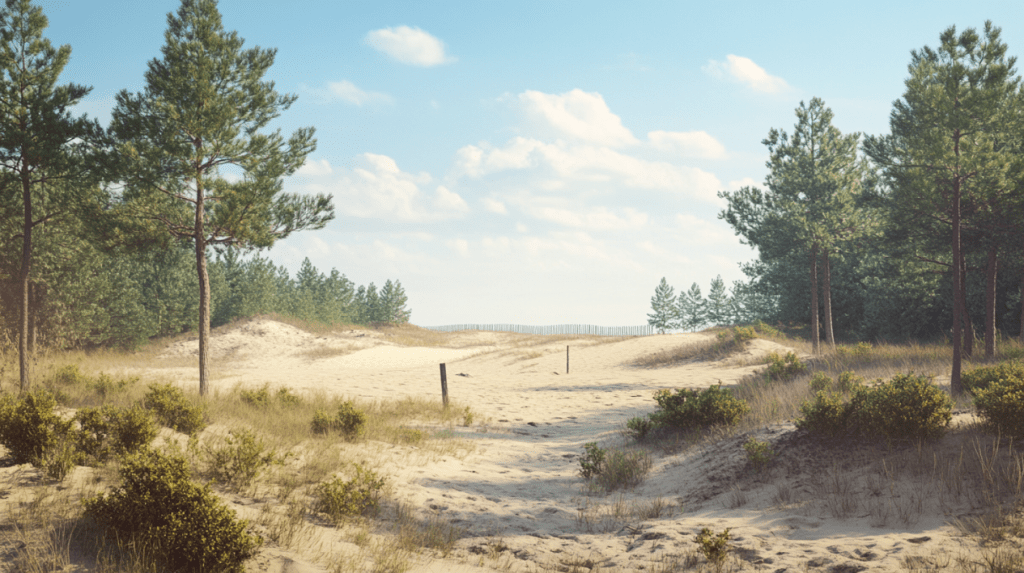 The road curved slightly, opening up to a view of pale dunes shimmering under the soft summer sun.