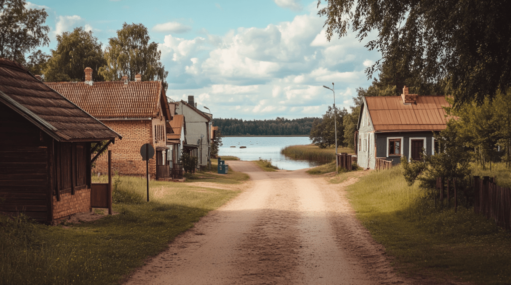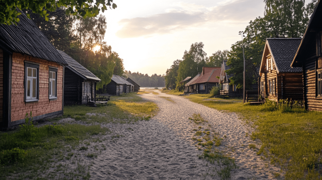 當他們抵達Juodkrantė時,天色已經開始染上柔和的傍晚色調。村莊靜靜地躺在潟湖邊,夕陽把水面映得微微發亮。