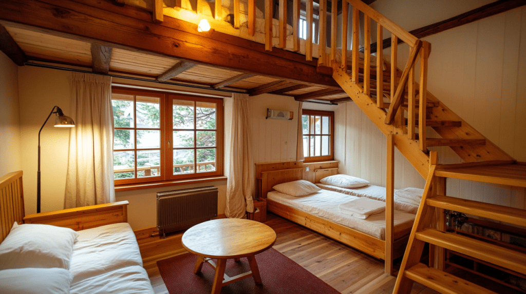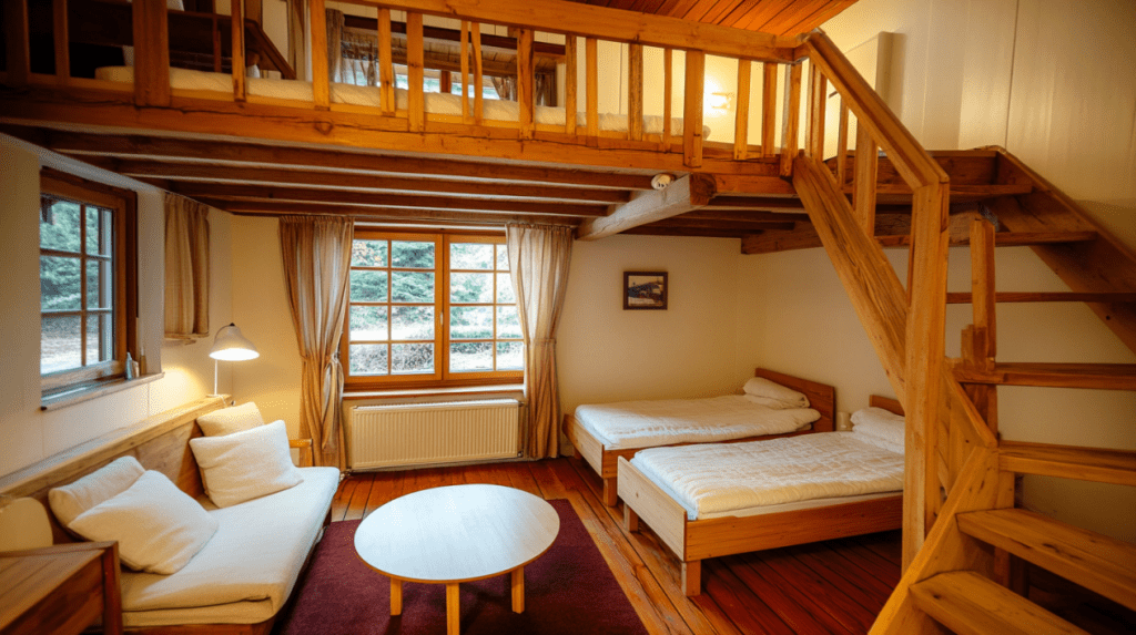 Each suite had the same layout — a living area downstairs with a couple of armchairs, a sofa, a small round table, and a narrow staircase leading up to a loft where three single beds were lined up under a slanted wooden ceiling.
