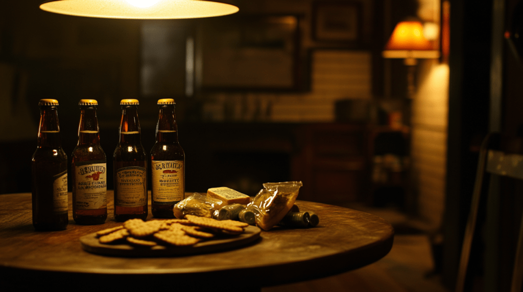 They gathered around the small round table downstairs, opening bottles and unwrapping the simple snacks. The warm light from the ceiling lamp made the wood grain glow softly.