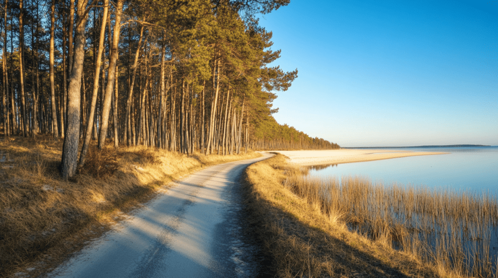 The road ran close to the lagoon at first, then cut gently through clusters of pine. To the right, dunes occasionally rose like pale humps beyond the trees; to the left, glimpses of water flashed silver in the morning light.
