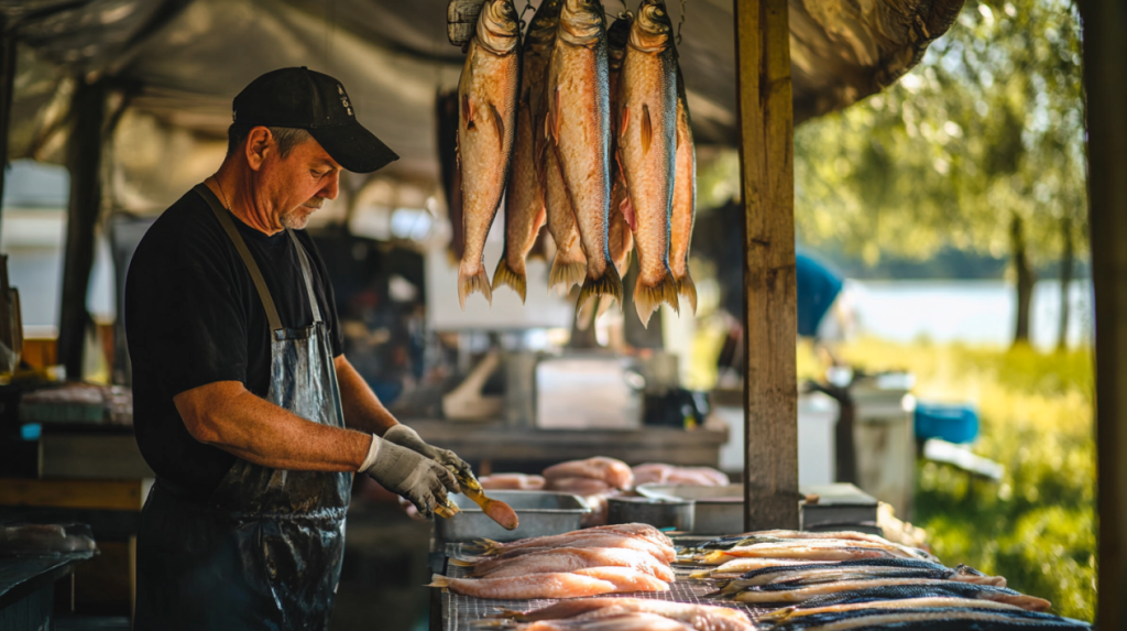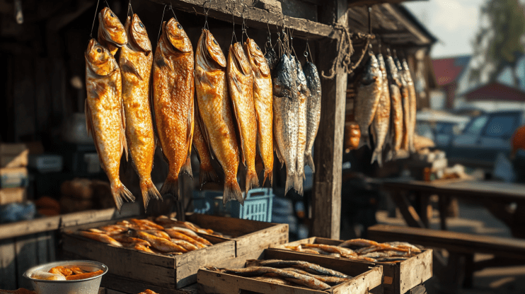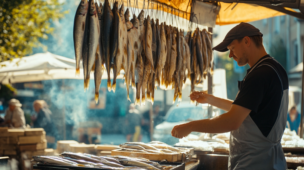 Stalls stretched beneath makeshift canopies and striped umbrellas. Smoked fish hung in rows from iron racks, their golden skins glinting in the light. Some were long and slender—probably pike or zander—while others were rounder, with darker backs. Nearby, wooden tables displayed crates of fresh perch, flounder, and the occasional eel, all laid on crushed ice or blue plastic sheets.