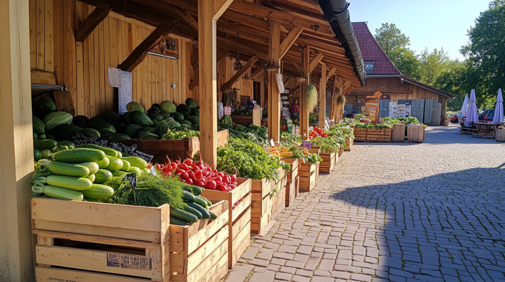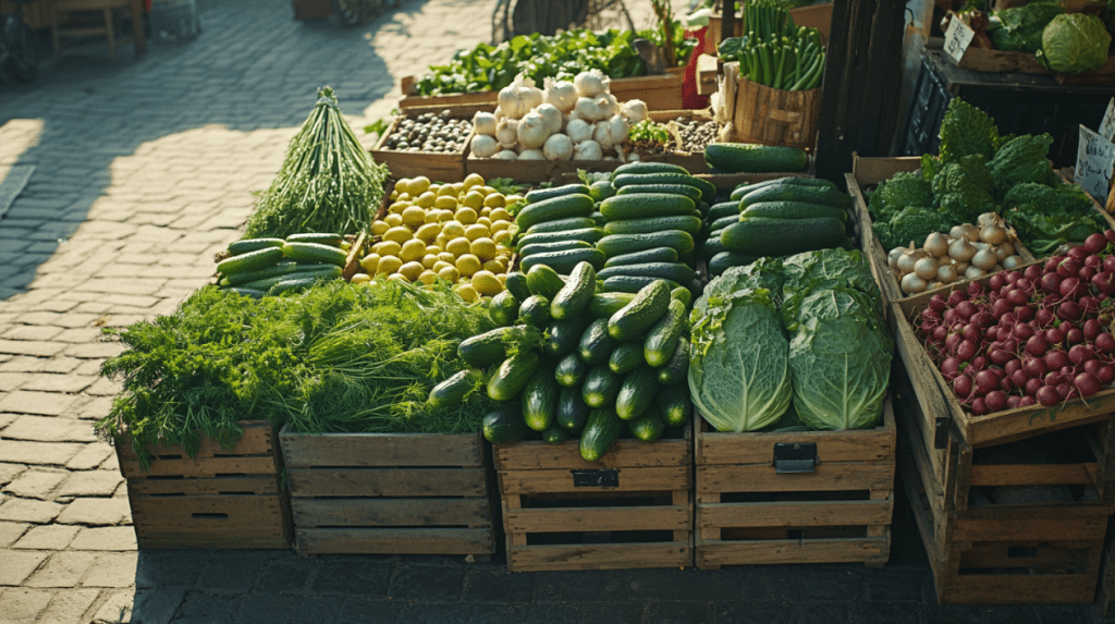 Tables overflowed with early summer produce—crisp cucumbers, bunches of dill, golden onions, red radishes, and pale green cabbage still beaded with dew.