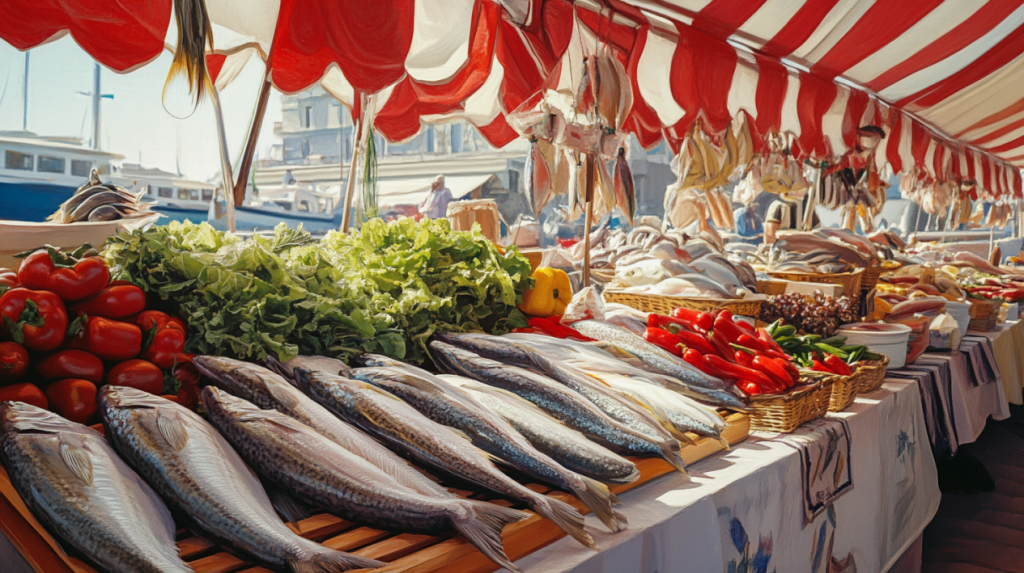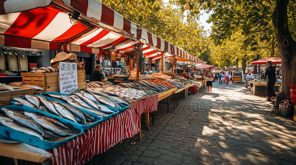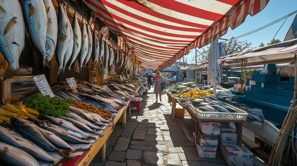 市場的棚架用鐵架和條紋遮布搭成,攤位上吊著一排排煙燻魚,魚皮在陽光下泛著金光。有的細長如梭魚,有的扁圓帶深色魚背;不遠處的木桌上鋪著碎冰或藍色塑膠布,擺著新鮮的鱸魚、比目魚、甚至有幾條鰻魚。