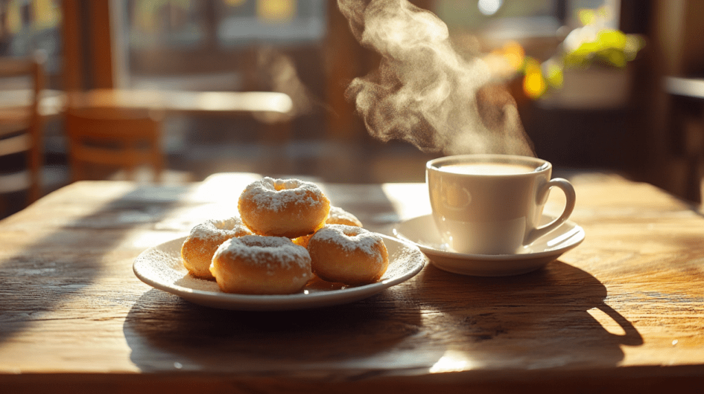 他們點了咖啡,也點了一盤還帶著熱氣的甜甜圈,每一口都帶點微酸的檸檬香與濕潤的嚼感。