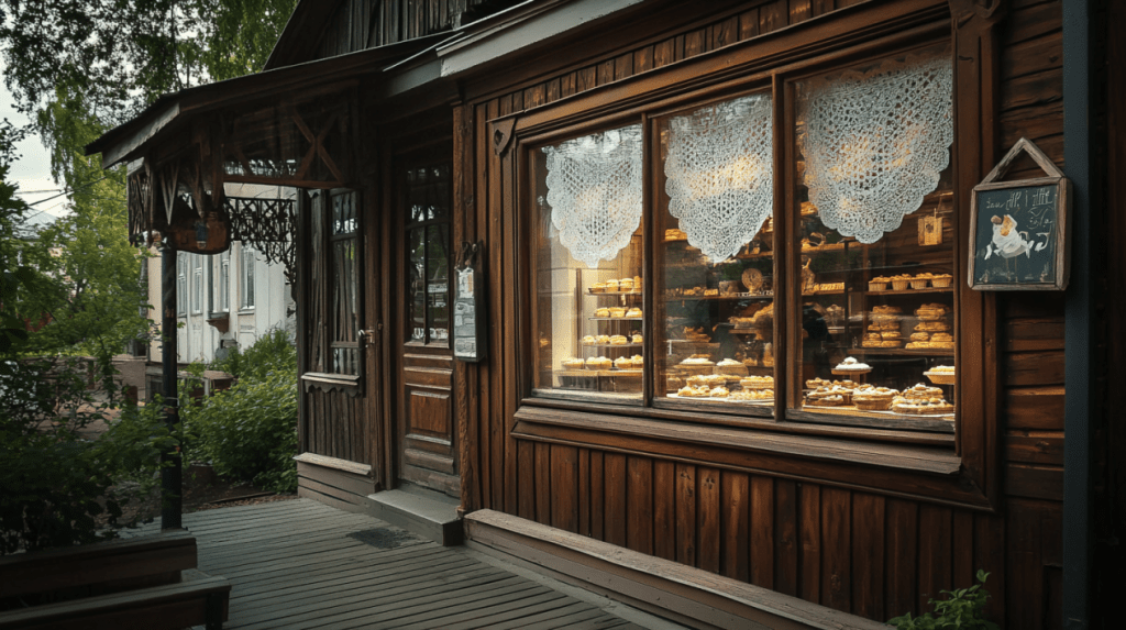 那家小店藏在一棟木屋裡,窗邊掛著蕾絲窗簾,門階微微傾斜不平。櫃台裡陳列著一排排 varškės spurgos——金黃色的凝乳甜甜圈,上面撒著糖粉;還有一盤 tinginys,像巧克力與餅乾混合的切片蛋糕,在燈光下微微發亮。