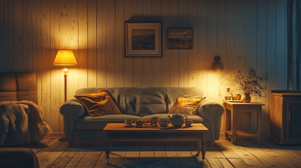 松木地板上映著立燈拉長的光影,桌上的陶瓷茶壺正悄悄冒著熱氣。