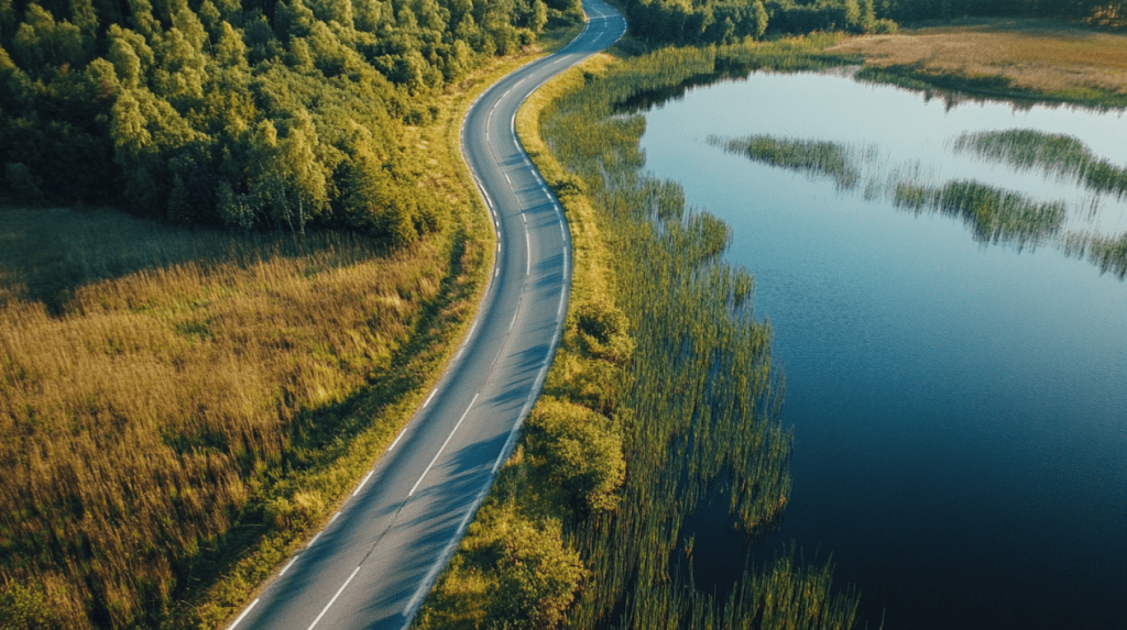 The road toward Lake Biržulis slowly curved through low hills and open meadows, where occasional clusters of birch trees and young pine interrupted the horizon. Morning light fell gently over the fields, and a fine mist clung to the surface of shallow depressions — remnants of ancient glacial activity.