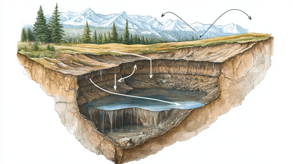 “Snowmelt and rainfall,” Julia replied. “The lake sits in a basin carved by retreating glaciers. In spring, melting snow runs down the slopes and fills the low points. And even if we don’t see any visible streams, the groundwater keeps cycling through.”