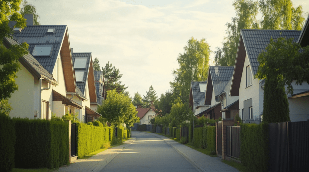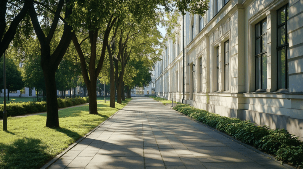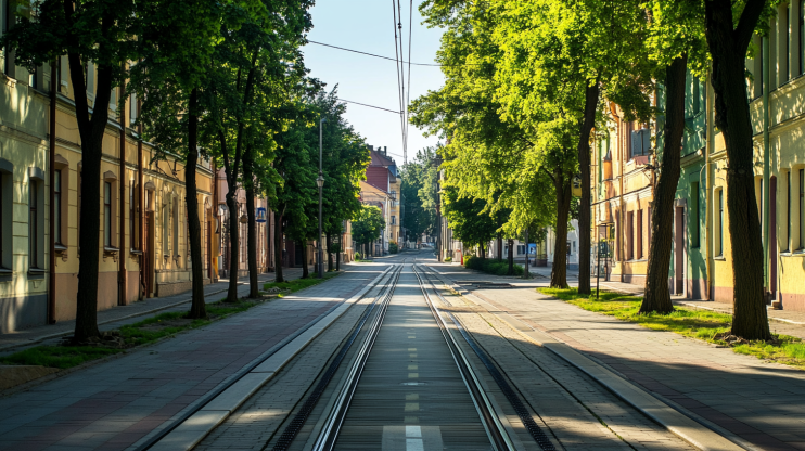 街道靜靜地延展,兩側建築交錯著早期 20 世紀的風格——有些外牆平整簡約,是典型的現代主義樣式;也有些還保留著老裝飾的痕跡,像是城市走到一半突然停住,再也沒續寫下去。