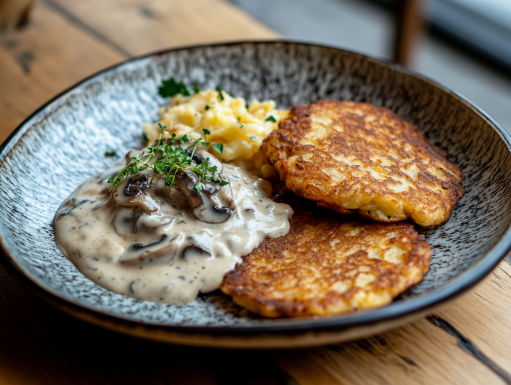 餐點此時上桌——酥脆的馬鈴薯煎餅、熱騰騰的湯、佐上蒔蘿奶油的黑麵包。對話暫時停下,大家各自嚐了一口。