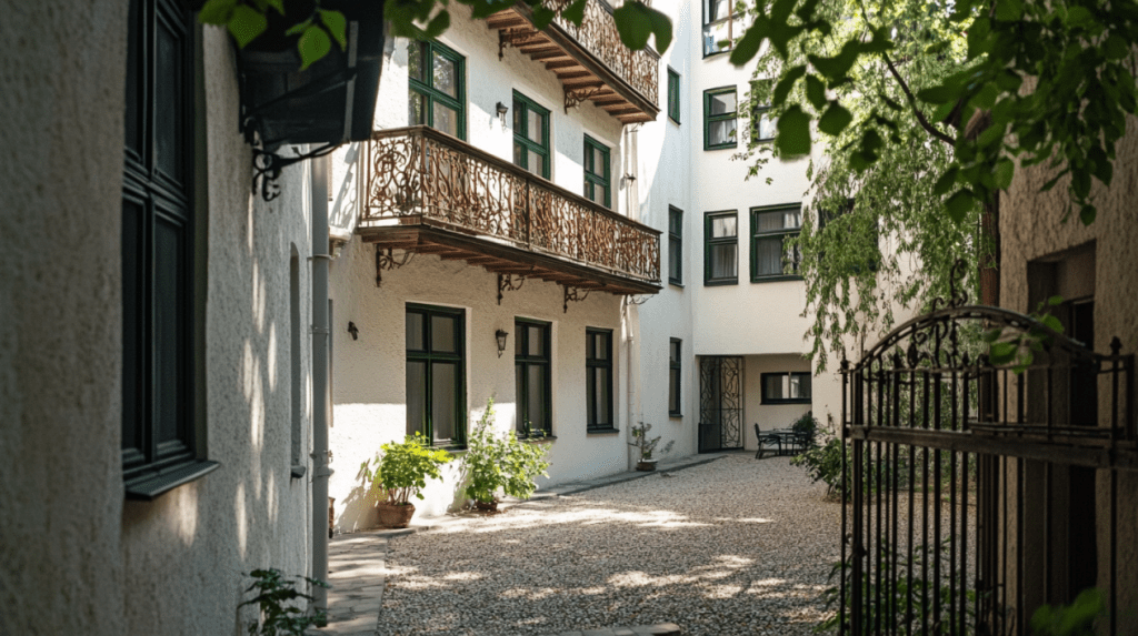 三層樓高的建築,白色粉刷牆面搭配深綠色窗框,二樓有個雕花木製陽台,正對著一片小院。鐵製大門輕輕嘎吱作響,車子停在栗樹遮蔭的小碎石車道上。