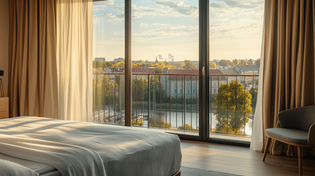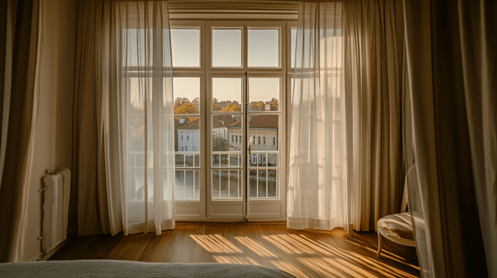 他們上樓,房間簡潔但帶著優雅:寬敞的窗戶、高高的天花板,亞麻窗簾在微風中飄動。從陽台望出去,可以看見考納斯的屋頂層層堆疊,遠方的尼曼河閃著微光。