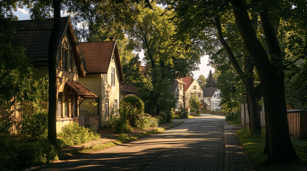 They turned a corner past an old chestnut tree and entered a narrower lane. The houses here were more modest—two-story dwellings, dark stucco walls, some with geraniums in the window boxes.