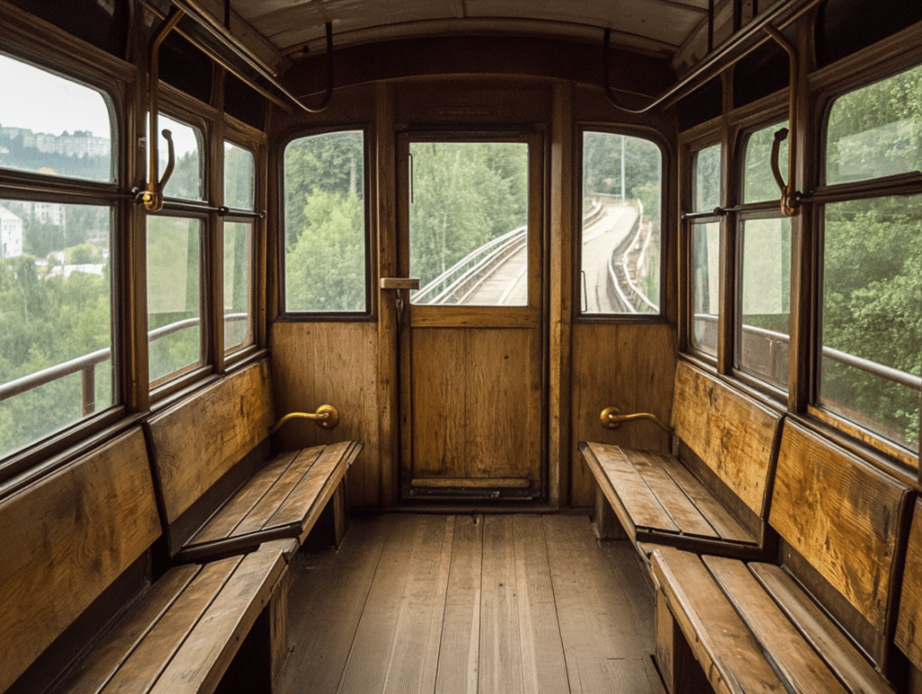 They entered the car—wooden benches, brass handles—and began to ascend. Outside, rooftops and antennas slipped away beneath them.