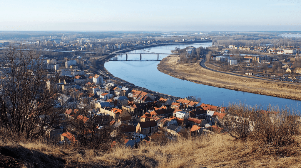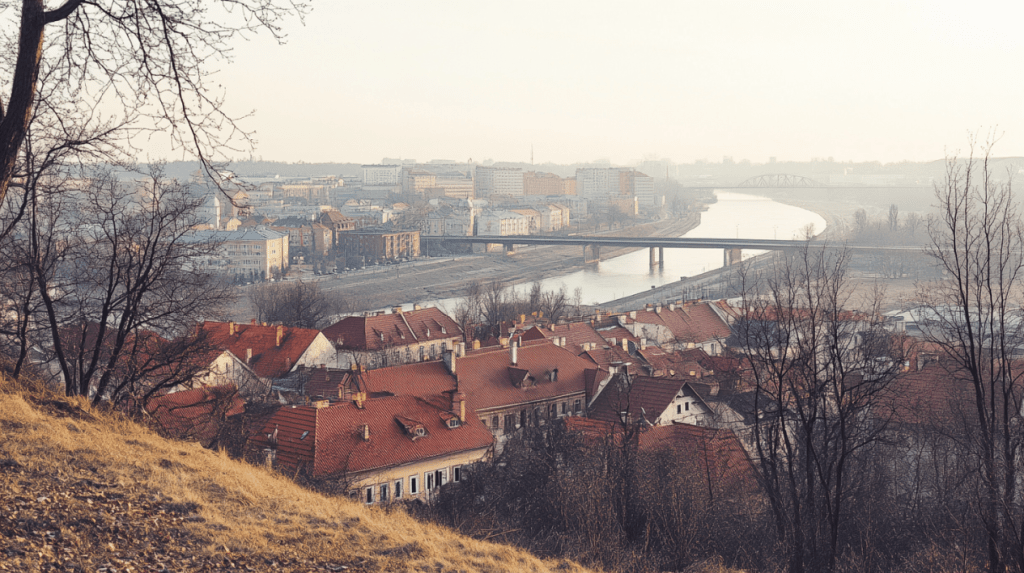 From here, Kaunas unfolded like a living map—the river curled through the city center, the red roofs of the old town pressed tightly together, and in the distance, bridges and neat rows of postwar apartment blocks stretched toward the horizon.
