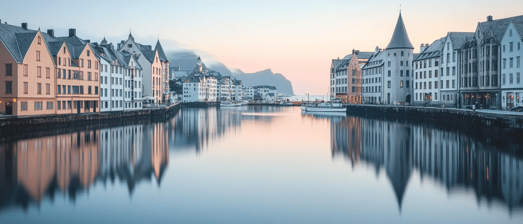 Through the windows, Ålesund came into focus: pastel façades, turrets, and spires reflected in still water.