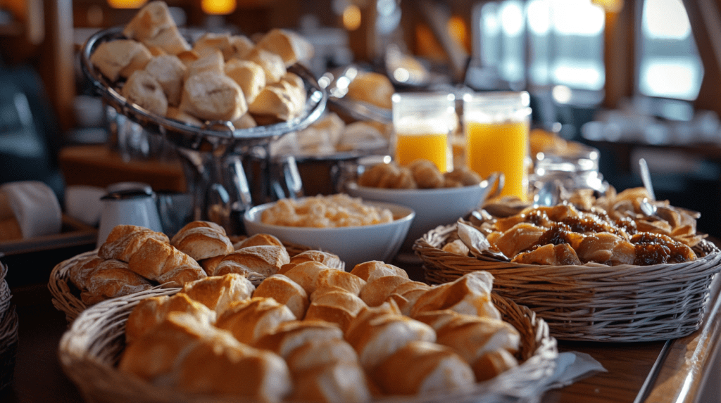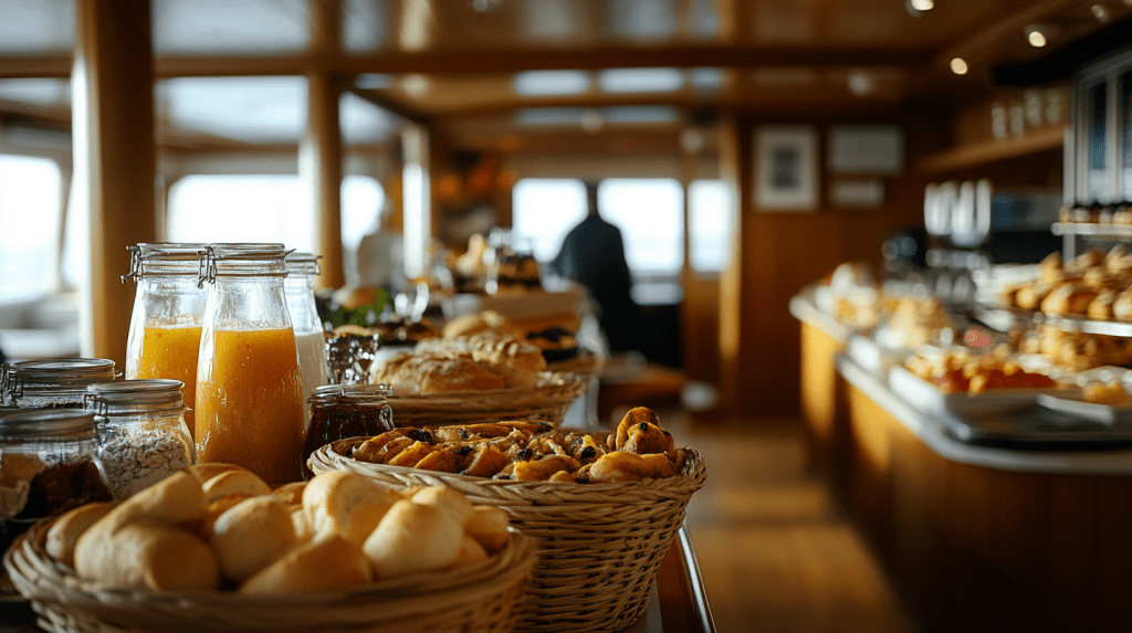 The dining hall offered baskets of rolls, smoked salmon, cloudberry jam, porridge, and pitchers of juice. Passengers filled their plates quickly, voices bright with anticipation.