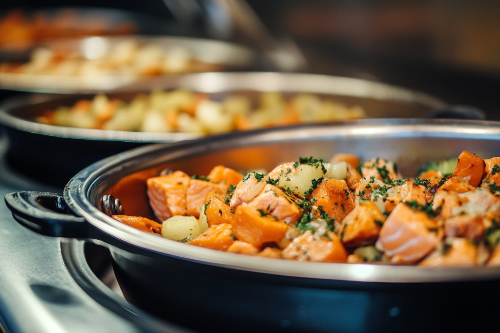 大片窗戶框起漸暗的海面;自助檯上擺著三種做法的鮭魚、馴鹿燉肉、各式根莖蔬菜與雲莓慕斯。