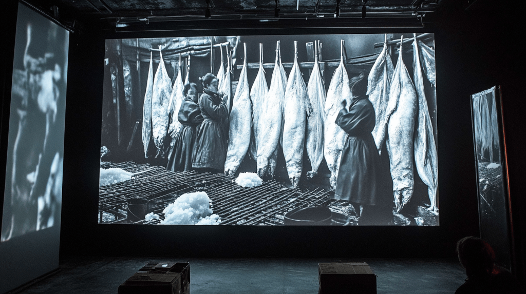 投影幕上出現一張舊照片:女人們在長木架上醃製鱈魚。