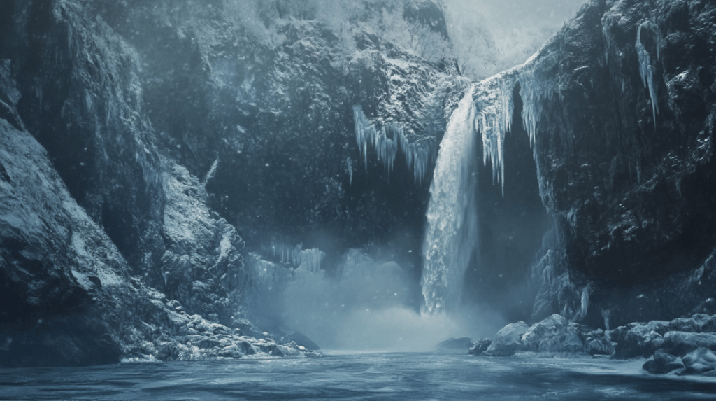 Another image filled the screen: a fjord in midwinter, frozen waterfalls shining silver against the rock.