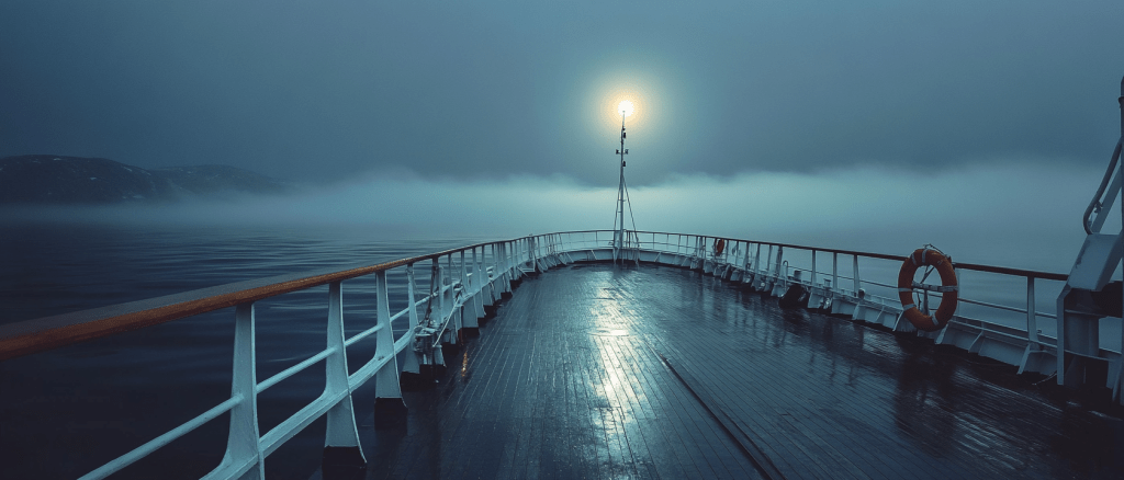 風猛地灌入,拉扯著圍巾與筆記本。海面漆黑,只有一道銀色的月光劃破波浪。船身的晃動比白天更為明顯。Emma 扶住欄杆,帶著一絲緊張的笑聲。