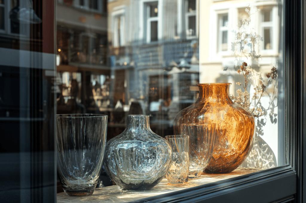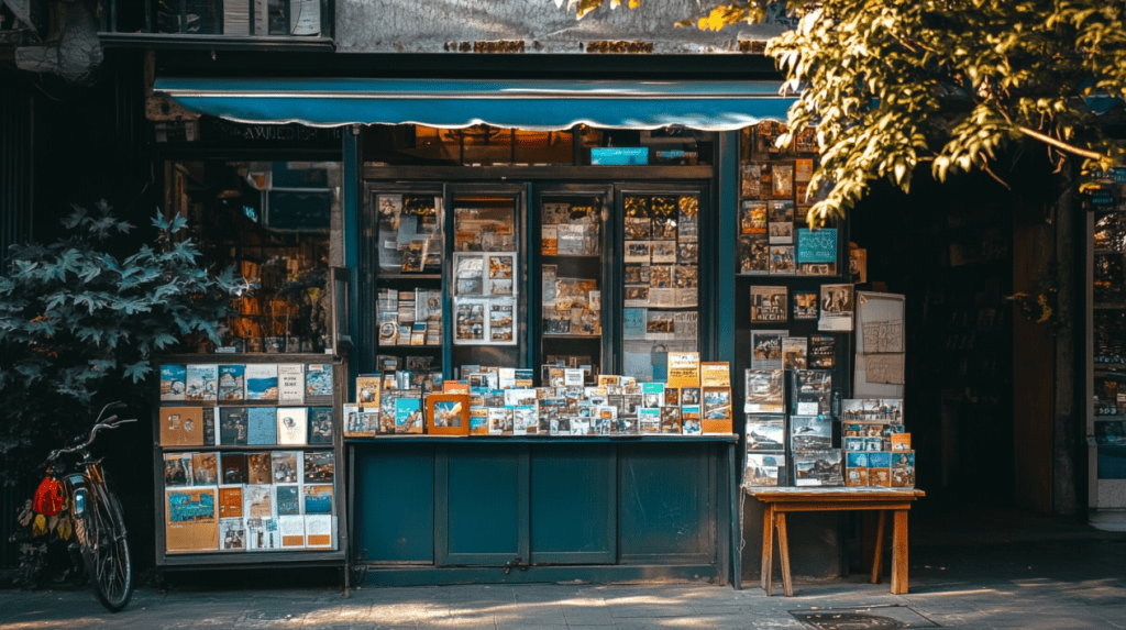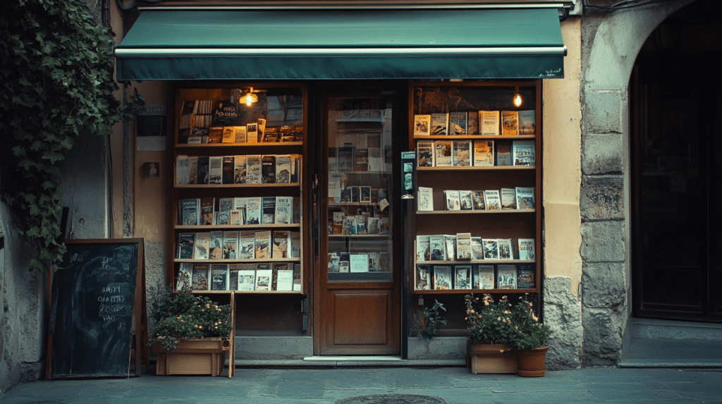A bookstore displayed postcards of the town itself, while a glassware shop adjusted its lamps to catch the morning light on fragile vases.