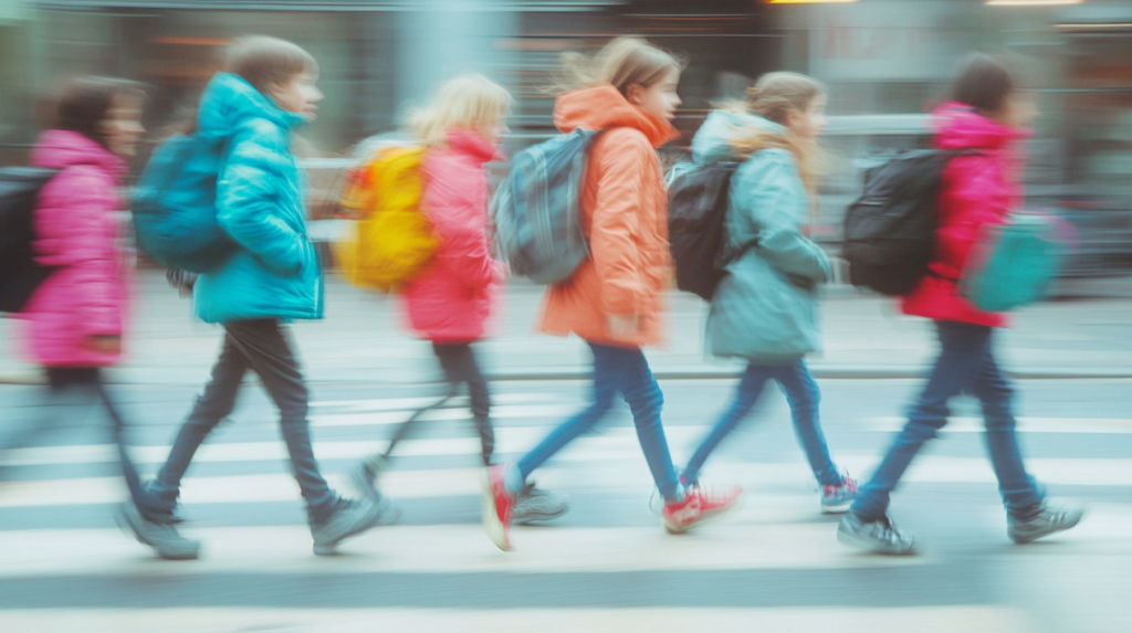 一群穿著鮮豔外套的學生在老師帶領下匆匆跑過,手裡夾著書本。