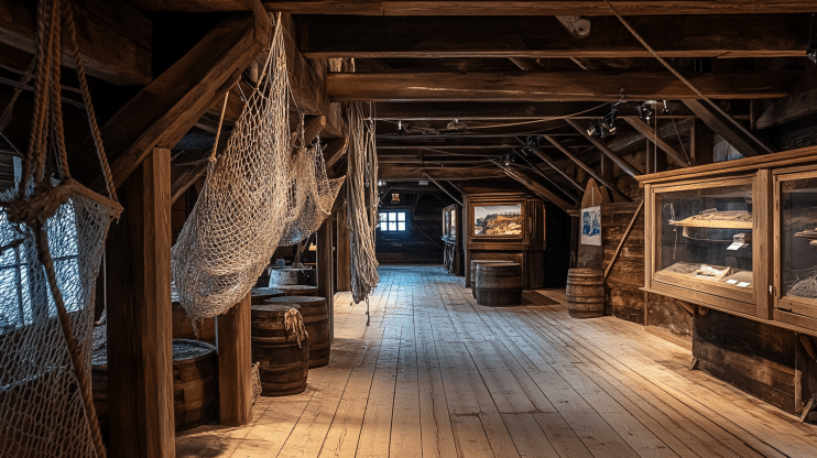 Inside, nets hung from the ceiling, and glass cases displayed tools once used to gut cod and pack herring.
