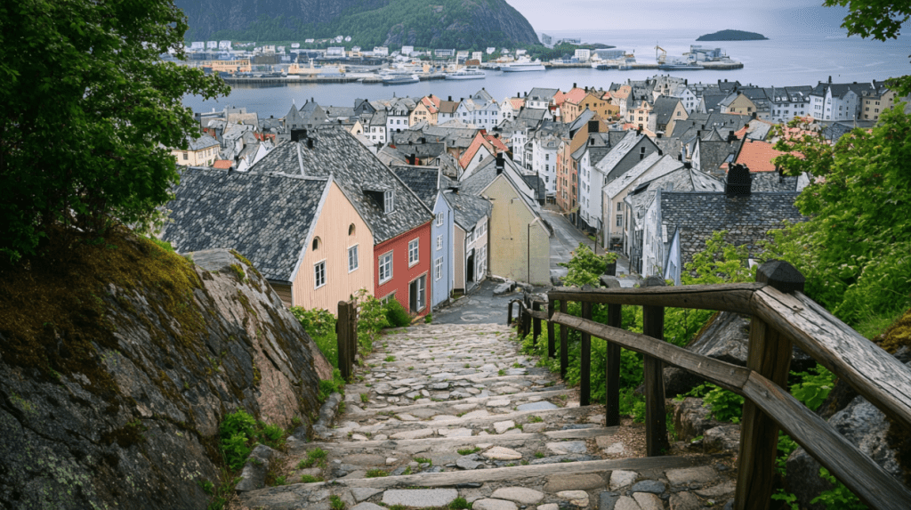 From a small square, stone steps began to climb toward Mount Aksla. With each turn, the town shrank beneath them. Ben hurried ahead with his tripod, while Ingrid sketched between steps.