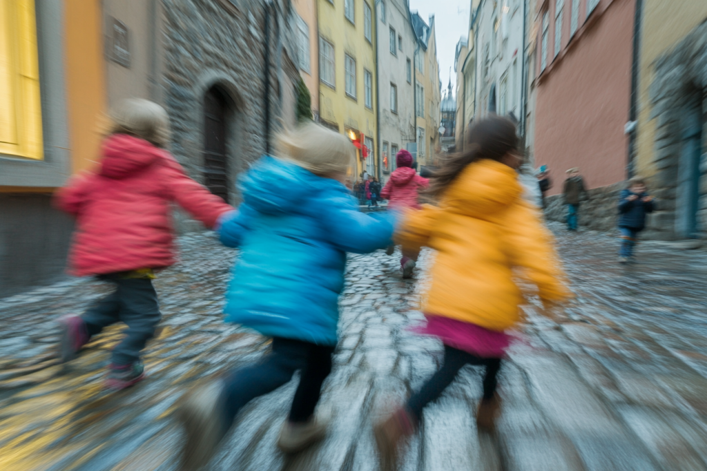 Children in bright jackets rushing across a cobblestone street, caught in blur.
