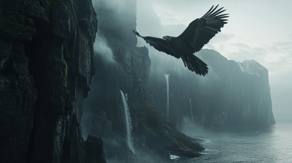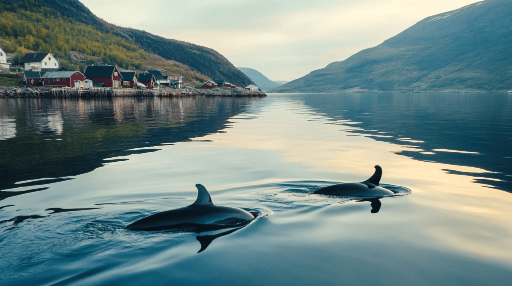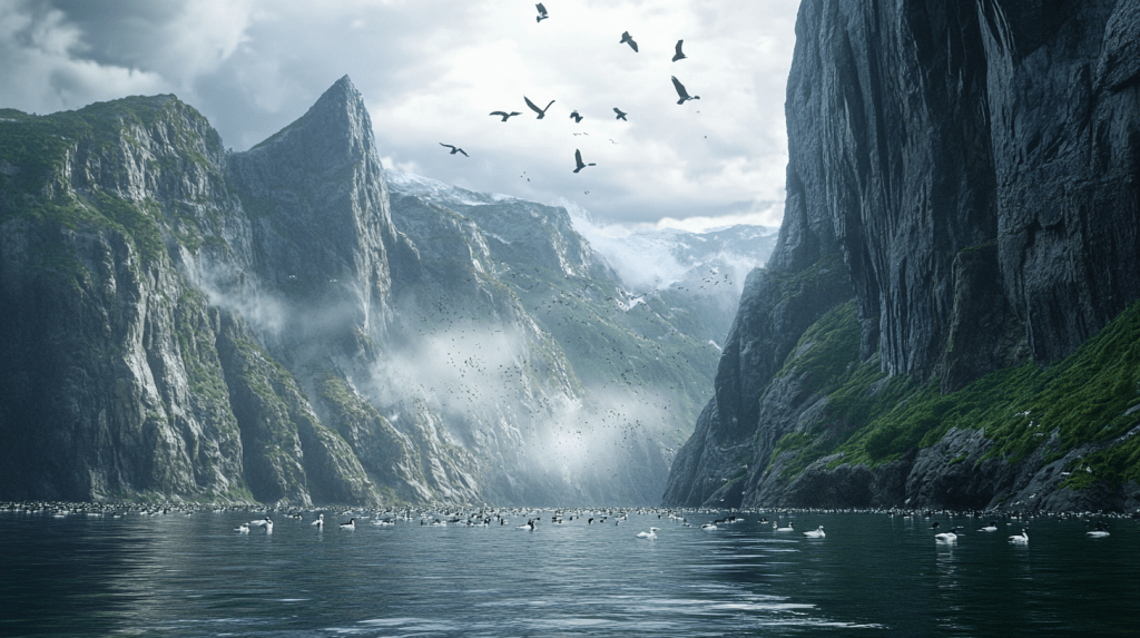 Julia answered, “Seabirds everywhere—eiders, gulls, even sea eagles on the cliffs. In summer, porpoises, sometimes small whales follow fish into the fjords.”