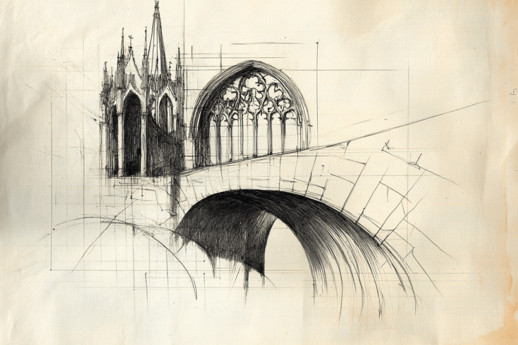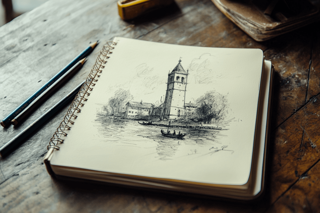 One page showed a canal tower in strong pencil strokes; another only fragments: arched windows, a bridge’s curve, the shadow of a spire.